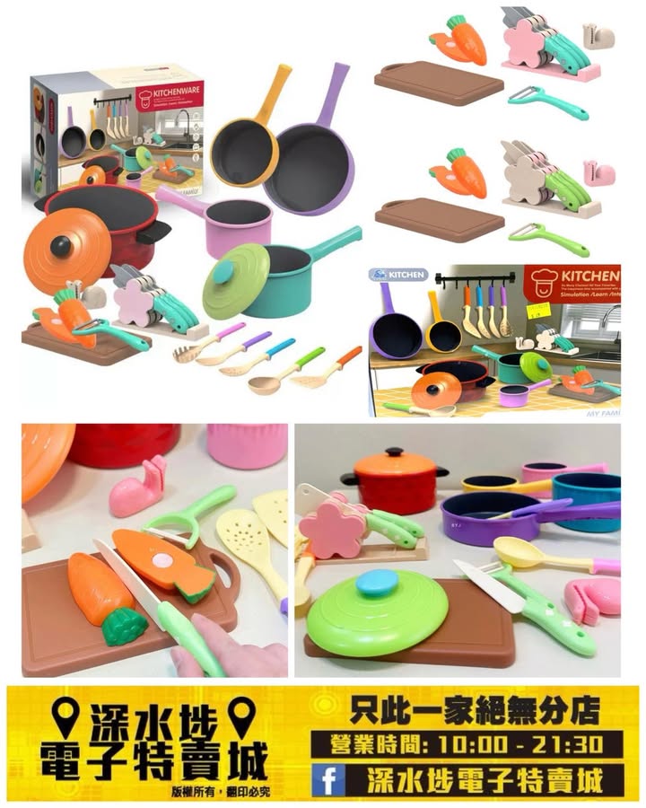 包括多種模擬廚具配件,如鍋具、平底鍋、餐具和食物