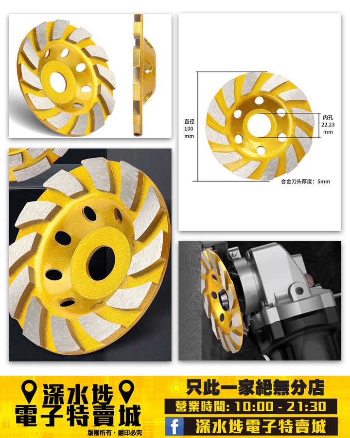 直徑100 mm,內孔22.23 mm,合金刀頭厚度5 mm