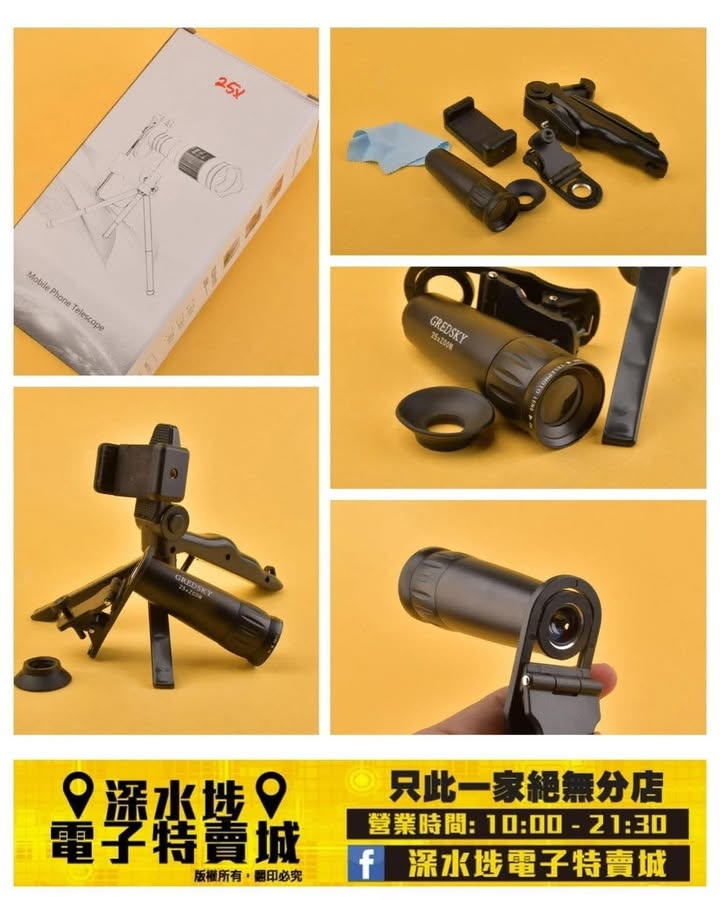 包括鏡頭、手機夾、三腳架和清潔布